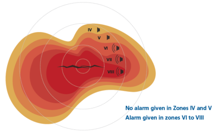 Depending of the adjusted threshold - sensitivity of the sensor - secty lifePatron® generates an alert if the intensity to be expected reaches a measure with which the first low damages can occur. These damages correspond on the EMS 98 scale to a value > "VI". The threshold is manually adjustable in steps in the device.